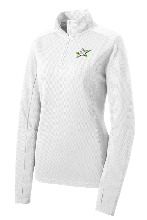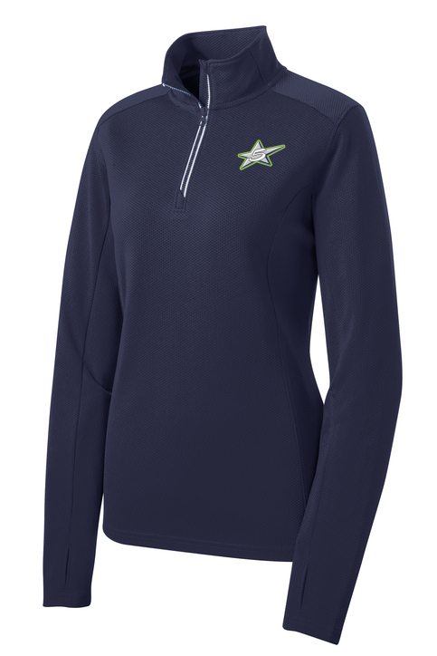 This mid-weight pullover has an unbeatable textured look with contrast zipper taping. Plus it performs by wicking moisture. 100% polyester Cadet collar Tag-free label Taped neck Dyed-to-match Vislon zipper and pull Silver zipper tape Angled chin guard for additional comfort Set-in sleeves Thumbholes to keep hands warm Front and back princess seams Open cuffs and slight drop tail hem Due to the nature of 100% polyester performance fabrics special care must be taken throughout the printing process.