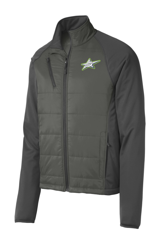 Quilted front and back panels join a water-resistant soft shell to make the Hybrid a trend-right performance jacket with an urban edge. 100% polyester knit shell bonded to a water-resistant film insert and a 100% polyester microfleece lining 100% nylon woven overlays Reverse coil zippers Interior storm flap with chin guard Zippered right chest pocket Front zippered pockets Port Pocket for easy embroidery access Binding at cuffs Open hem with adjustable locking drawcords
