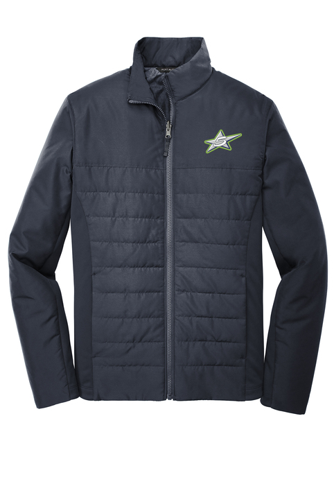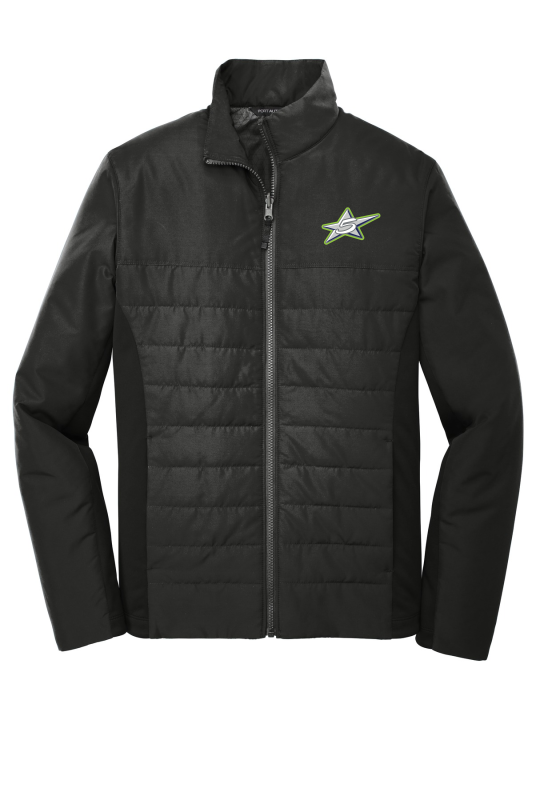 This jacket combines the warmth of low-bulk quilted insulation with flexible soft shell side panels for a trend-right weather-resistant look. Can be zipped in and secured by snap attachments inside an outer Collective layer 100% polyester woven shell 100% polyester printed lining with 100% polyfill insulation behind the outer quilted woven shell 100% polyester knit bonded to a water-resistant film insert and a 100% polyester microfleece lining at side panels and under arms Slightly longer length Molded center front zipper Stretch side panels Open front pockets Port Pocket for easy embroidery access